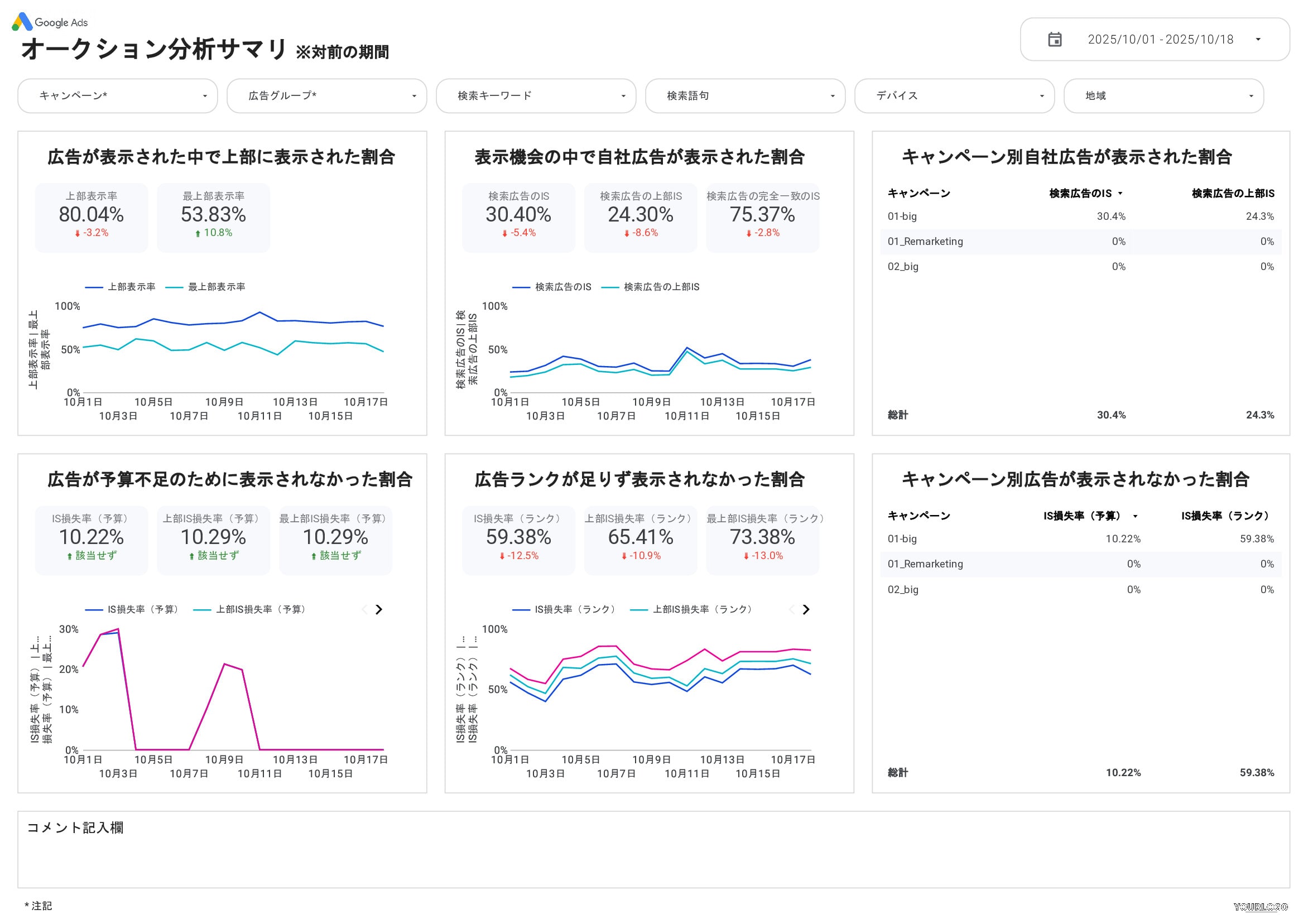 最上部IS損失率(ランク) | 検索広告の最上部インプレッション シェア損失率(ランク) | 広告ランク不足により最上部表示を逃した割合です。特に競合が強い場合に上昇しやすい指標です。 |