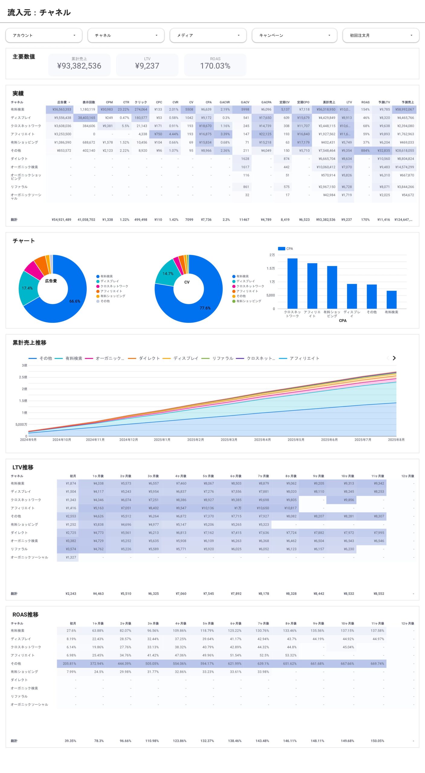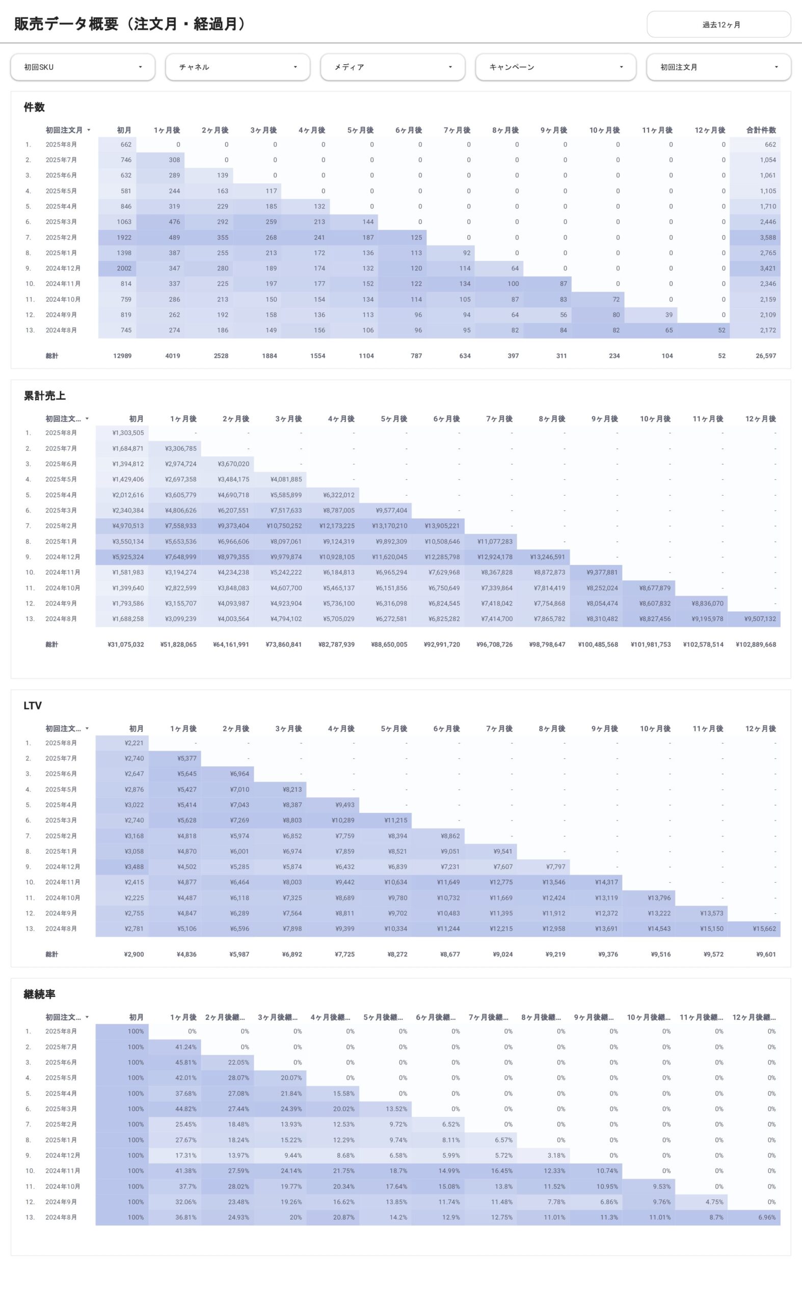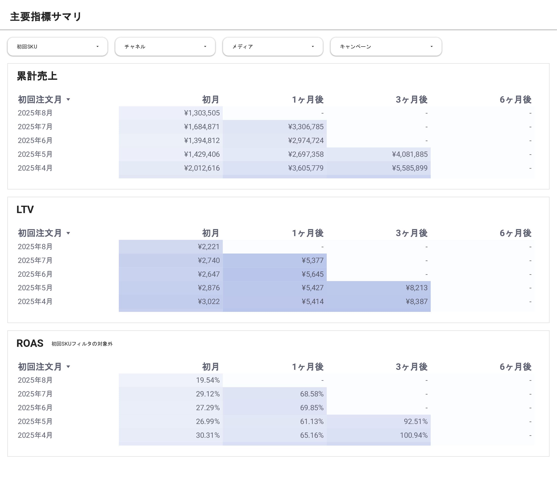 散らばった広告データ・販売データ・ウェブ上の行動履歴をひとつに統合し、売上・ROAS・LTVを自動で可視化できるD2C向けレポートダッシュボードです。