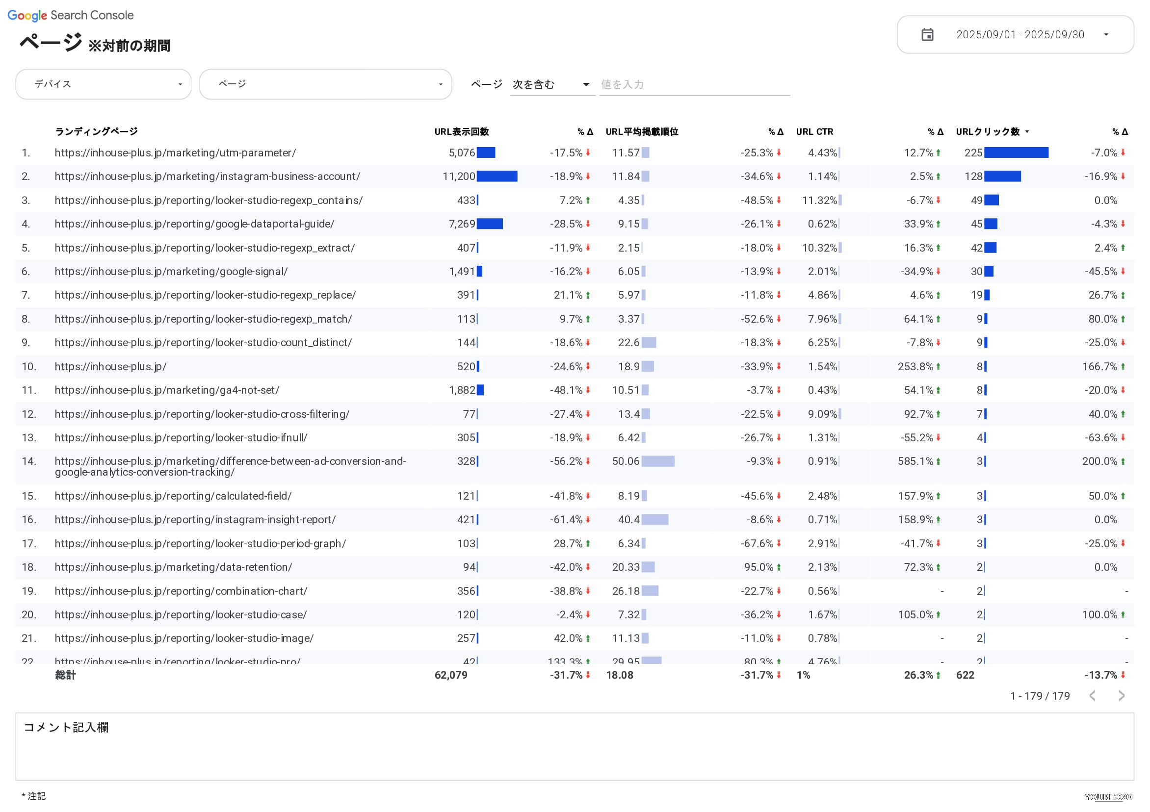 Googleサーチコンソールの管理画面で使えるほぼすべての項目が利用可能です。詳しくは実際のLooker Studioのデータソース(サイトのデータソースとURLのデータソース)でご確認ください。
