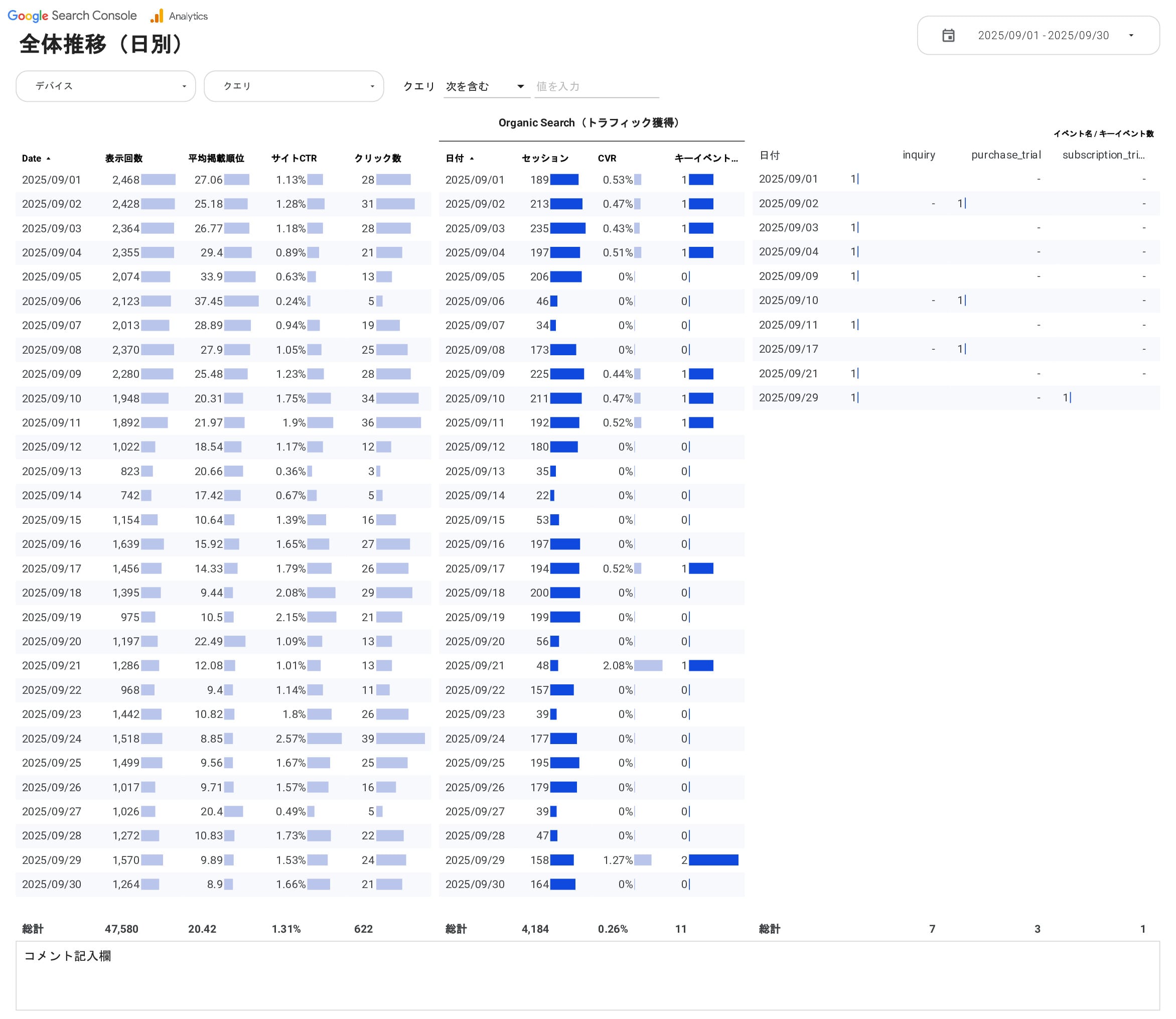 平均CTR | 平均CTR | 表示されたうち、実際にクリックにつながった割合です。 |